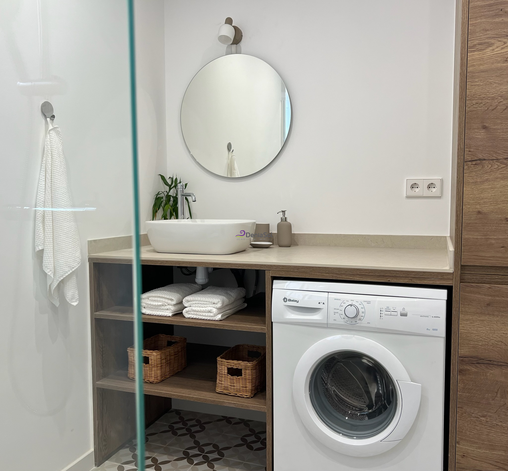 La cocina americana de vitrocerámica está completamente equipada con nevera, congelador, microondas, horno, lavavajillas, cafetera, tostadora, exprimidor y todo lo necesario para preparar tus comidas. Además, cuenta con lavadora para tu comodidad.
