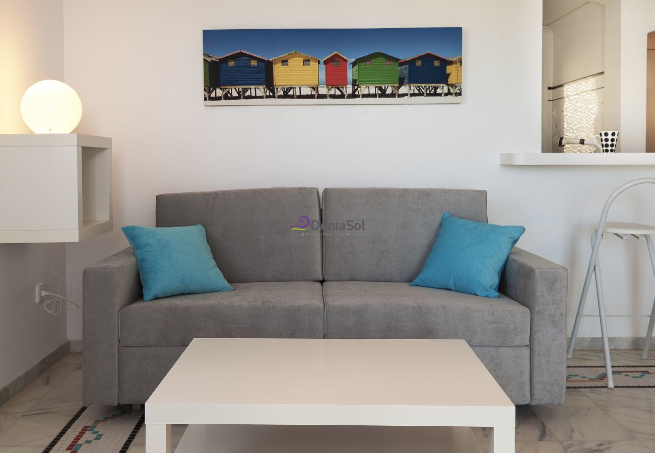 Rental Apartment in Denia. This beachfront apartment is situated only 6km. from Denia town and there is a large variety of restaurants aprox.1km. of distance of the apartment. With capacity for 4/5 people. Situated in Alberca complex, this apartment has communal gardens with lawn with large swimming-pool and wade pool for children. The apartment has a balcony, where you can enjoy some al fresco dining. With lounge dining room with T.v., kitchen with washing machine, oven, hob, fridge/freezer, toaster...2 bedrooms and 1 bathroom. It has air conditioning in the living-rooms and funs in the bedrooms.