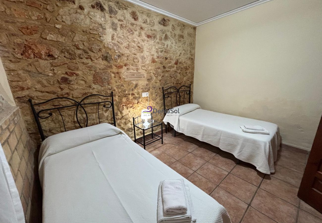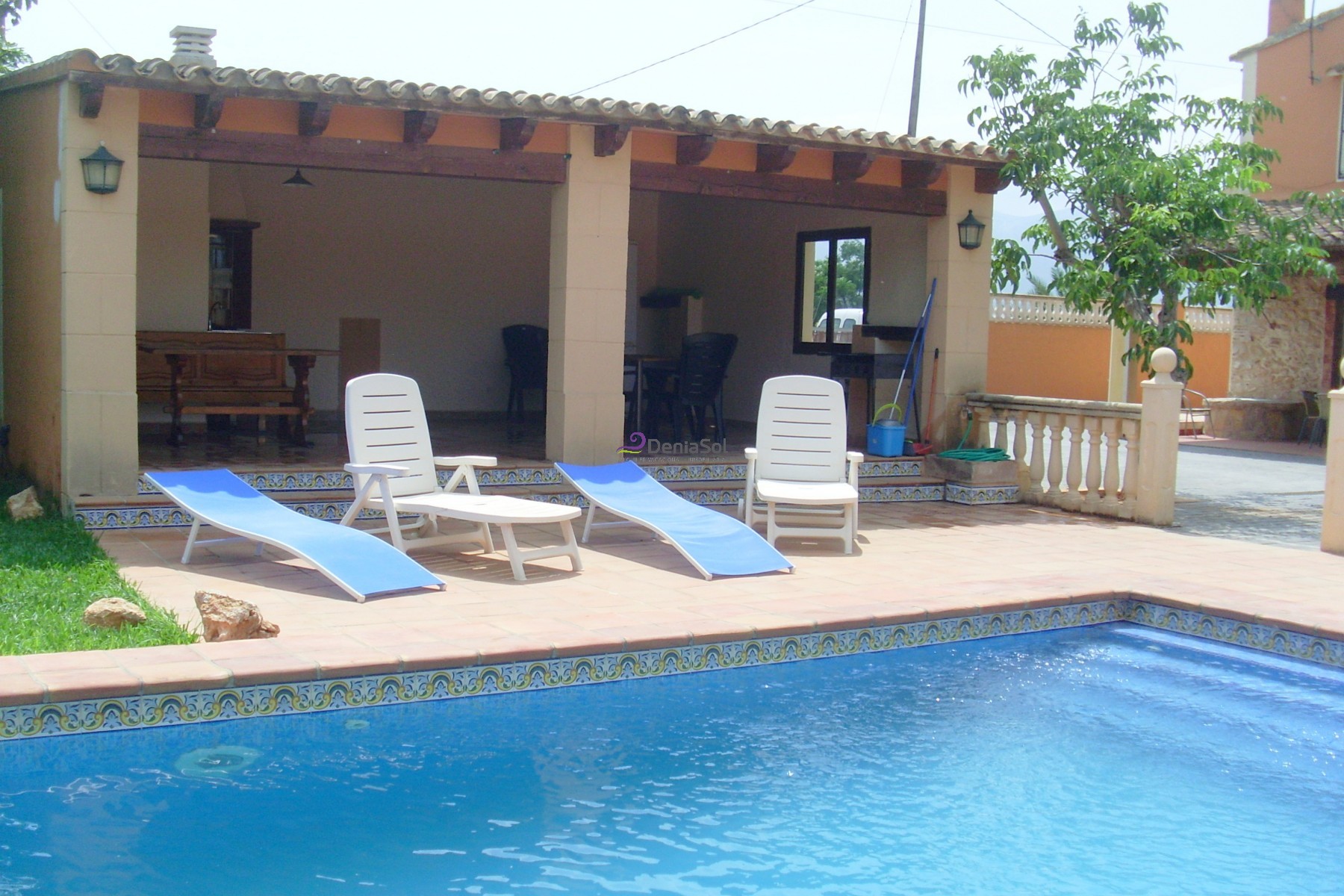 Rental Villa in Denia, in a rustic stile consistently with its surroundings, situated in a very quiet and flat area, 1 Km to Denia center and 2 Km to the beach. Big plot with frutal trees, terrace pool area with views of the surrounding countryside, garden furniture, private pool , barbecue and parking for several cars. With capacity for 8 people, the villa has lounge with chimeney and TV, closed kitchen, 4 doble-bedrooms,2 bathrooms. Big covered terrace.
