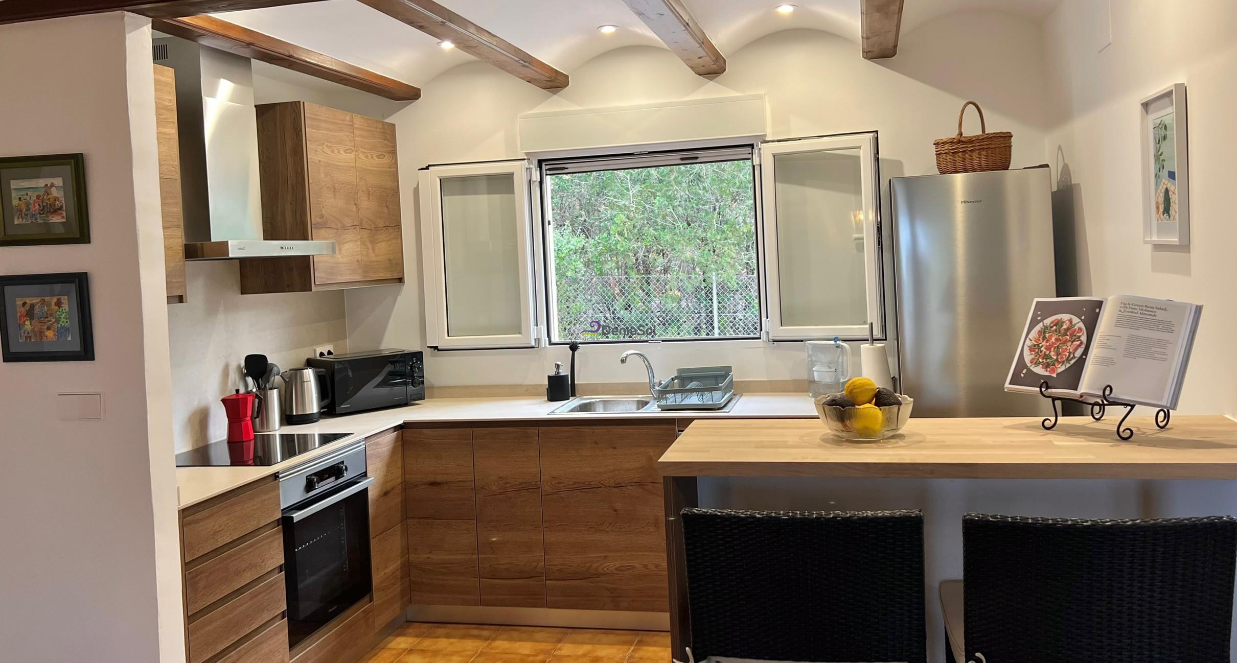 La cuisine américaine avec plaque de cuisson en vitrocéramique est entièrement équipée avec réfrigérateur, congélateur, micro-ondes, four, lave-vaisselle, cafetière, grille-pain, presse-agrumes et tout le nécessaire pour préparer vos repas. De plus, elle dispose d'une machine à laver pour votre confort.